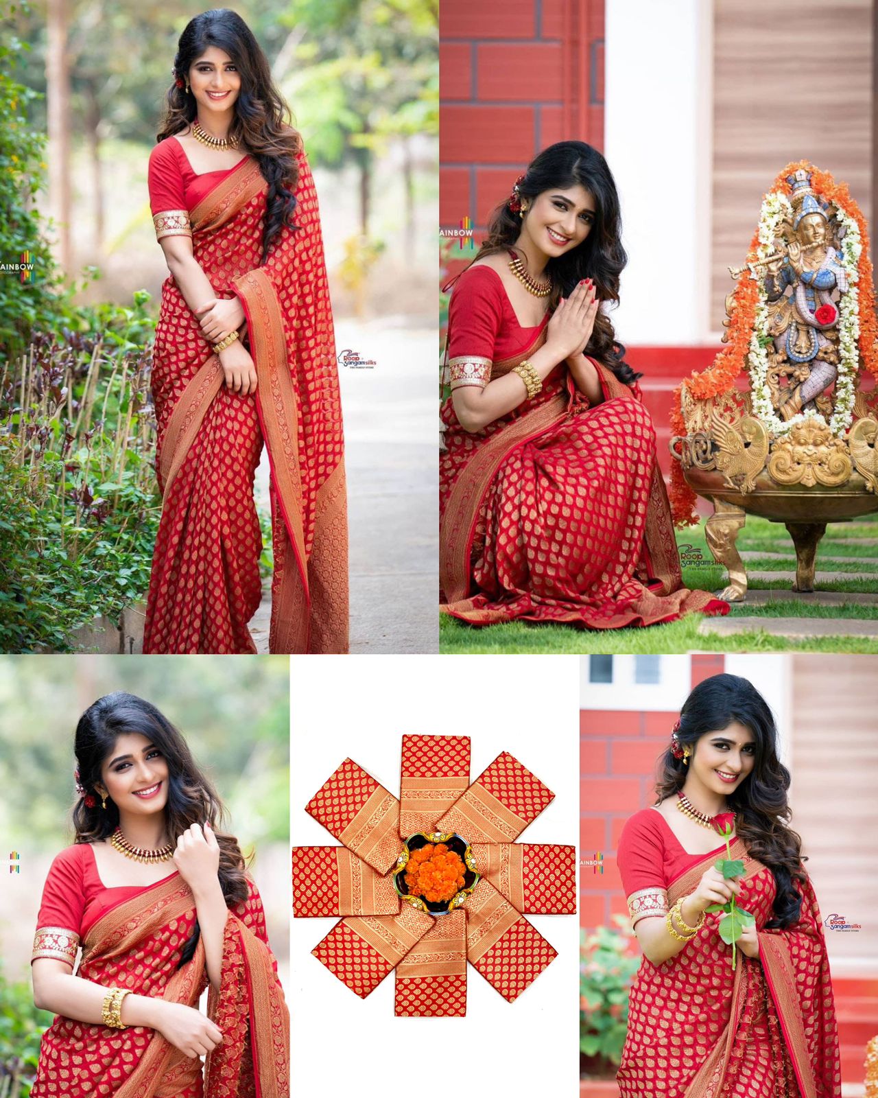 This saree features a luxurious pallu, intricately woven with fine threads of silk, satin, or other high-quality materials, creating a rich and opulent border that drapes gracefully over the shoulder. The pallu often showcases elaborate designs, motifs, or patterns, adding a touch of regal charm to the overall ensemble.
