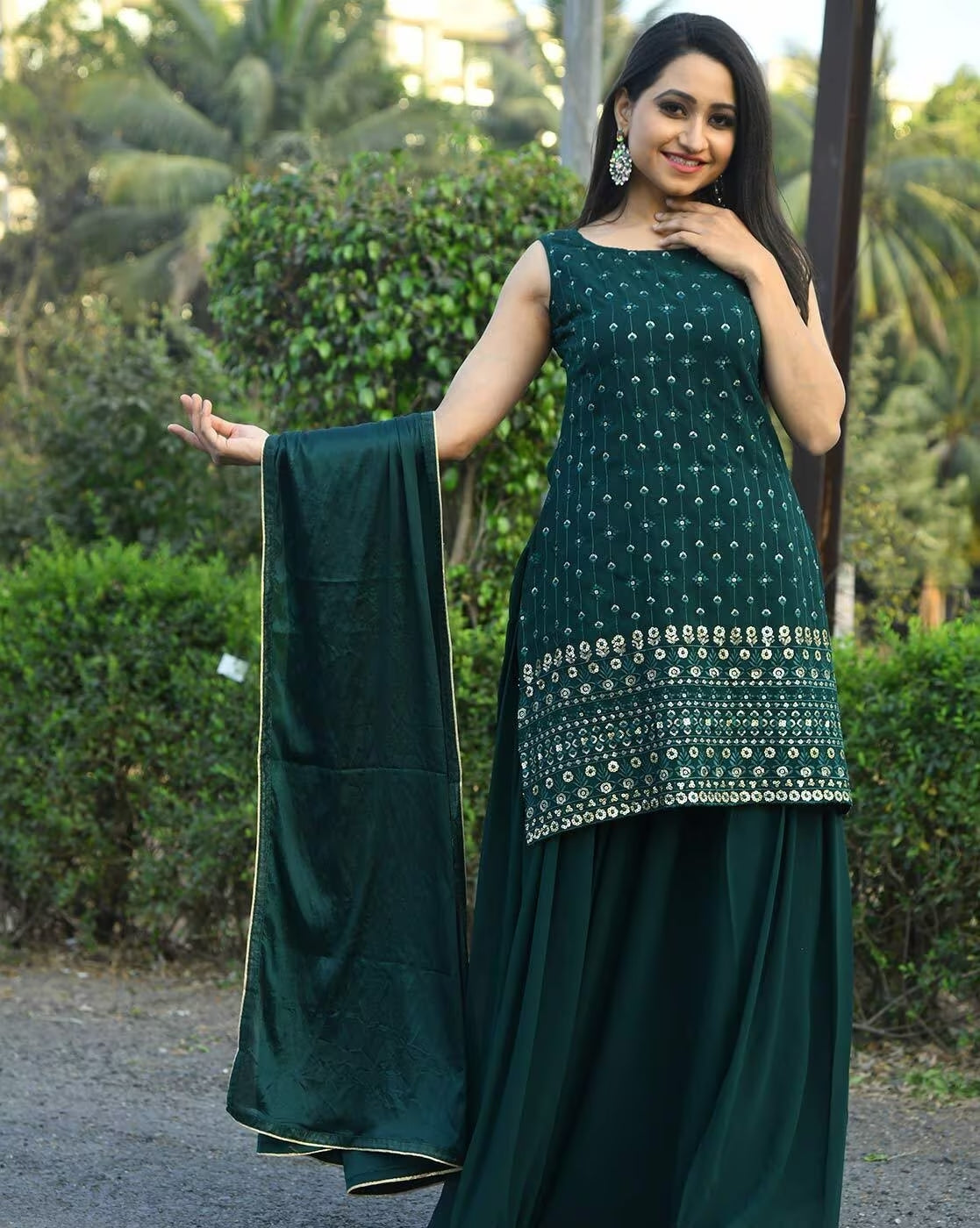 Expertly crafted with green colour embroidered georgette, this sleeveless sharara 3-piece set is the perfect outfit for any occasion. The delicate embroidery adds a touch of elegance while the lightweight fabric ensures comfort and style. Complete your look with this luxurious and versatile set.