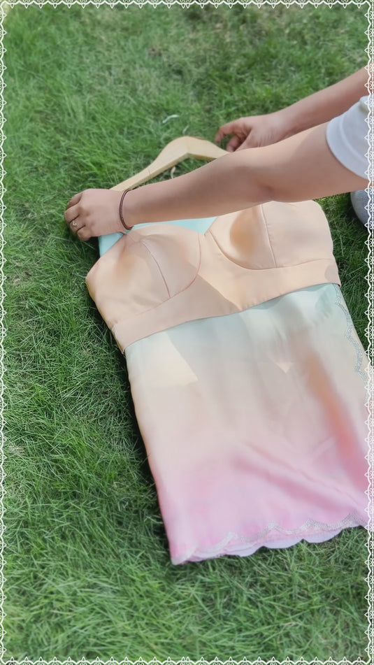 Expertly crafted from pure satin georgette, this exclusive ombre print saree combines luxury and style. The lightweight fabric drapes beautifully and the bold print adds a touch of modernity. Elevate your ethnic wardrobe with this statement piece.
