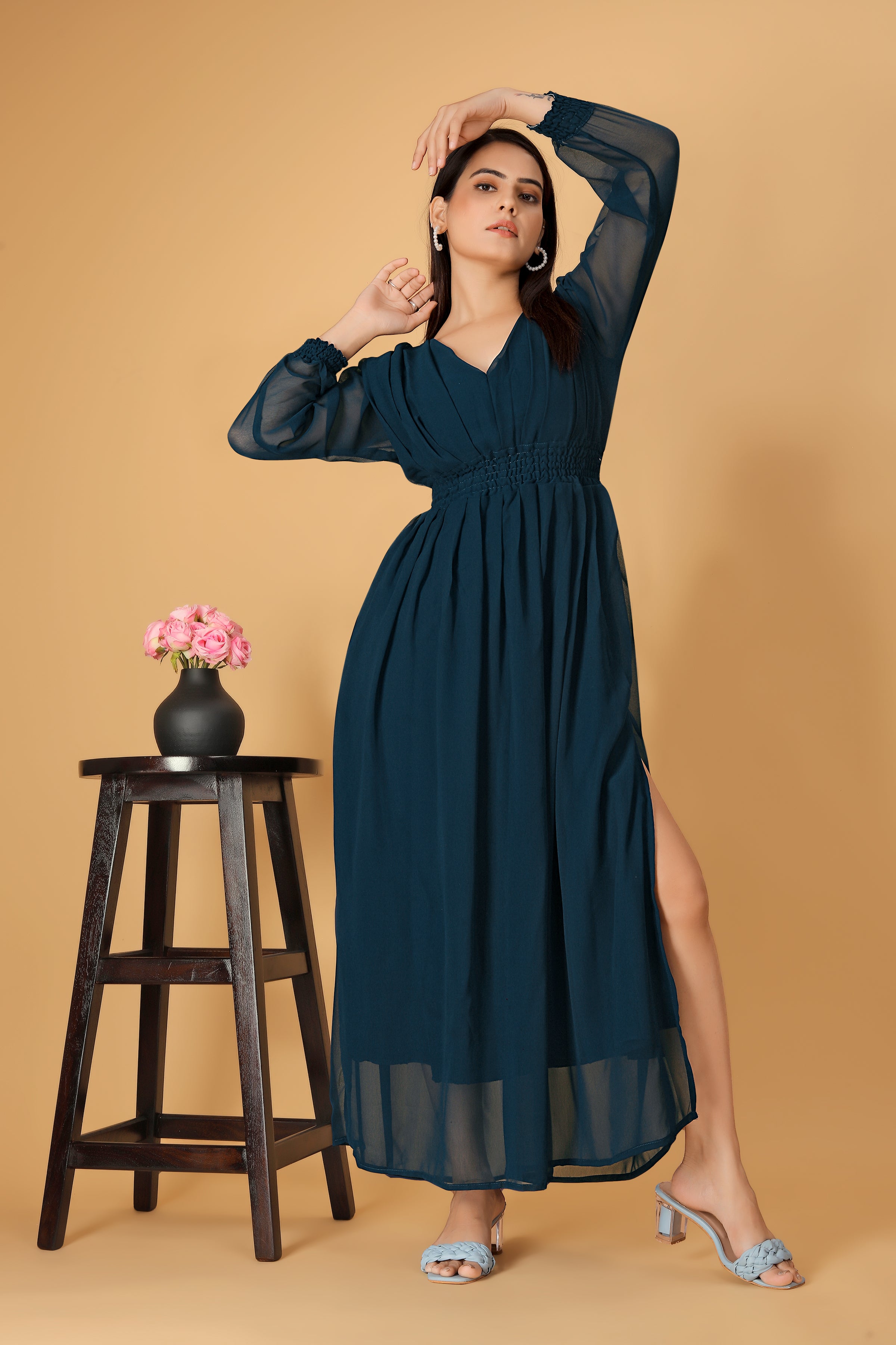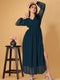Name | The Vendor Villa Printed V Neck Georgette Fancy Teal Green Color Full Length Dress For Women |