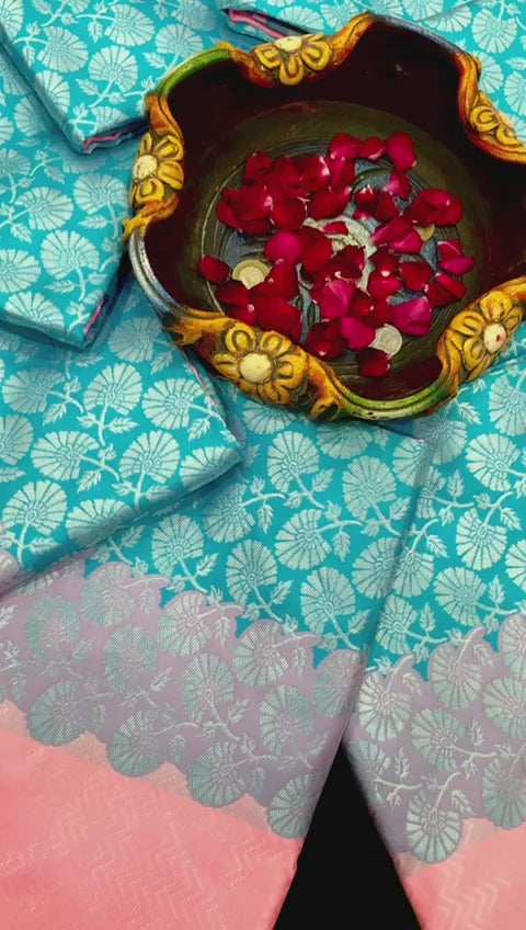 Additionally, the saree boasts intricate jacquard work all over its body. Jacquard weaving is a technique that allows for complex designs to be woven directly into the fabric, resulting in stunning patterns and textures. The jacquard work on this saree is likely to include intricate floral motifs, geometric patterns, or traditional motifs inspired by nature, culture, or heritage.