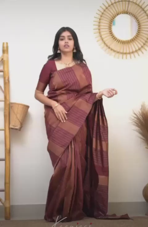 Additionally, the saree boasts intricate jacquard work all over its body. Jacquard weaving is a technique that allows for complex designs to be woven directly into the fabric, resulting in stunning patterns and textures. The jacquard work on this saree is likely to include intricate floral motifs, geometric patterns, or traditional motifs inspired by nature, culture, or heritage.