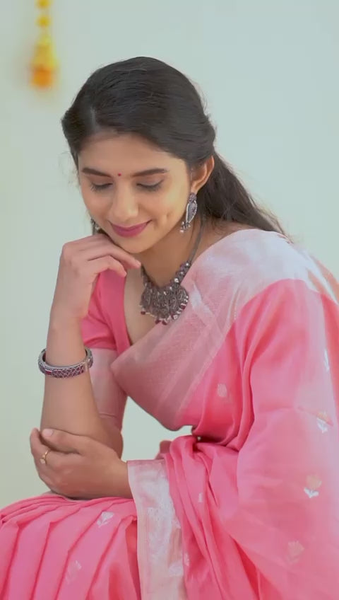 This saree features a luxurious pallu, intricately woven with fine threads of silk, satin, or other high-quality materials, creating a rich and opulent border that drapes gracefully over the shoulder. The pallu often showcases elaborate designs, motifs, or patterns, adding a touch of regal charm to the overall ensemble.