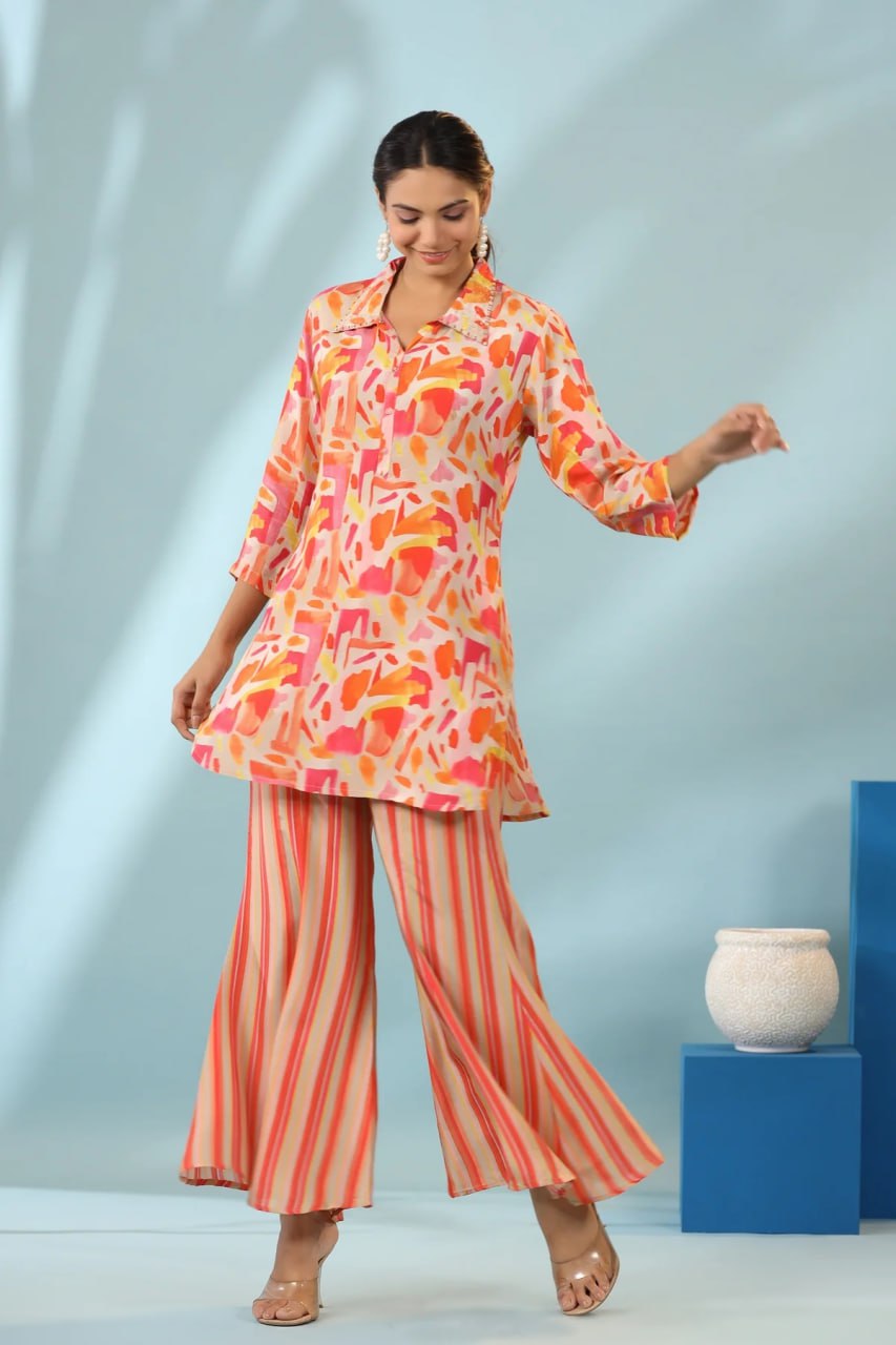 This Vibrant Felicity On Cotton Bland Silk Co-Ord Set is the perfect addition to your wardrobe. Crafted with a blend of cotton and silk, this set offers a luxurious and comfortable feel. The vibrant design adds a pop of color, making it perfect for any occasion. Elevate your style with this expertly crafted and fashionable co-ord set.